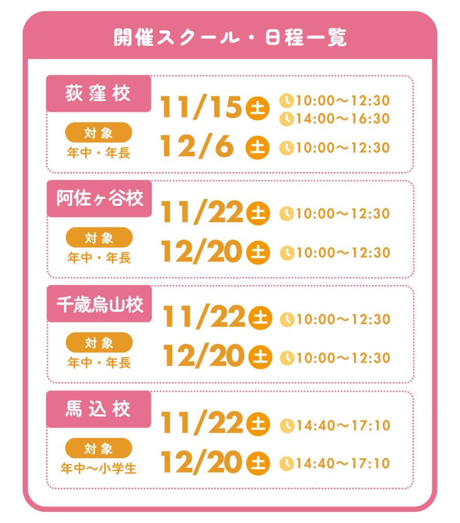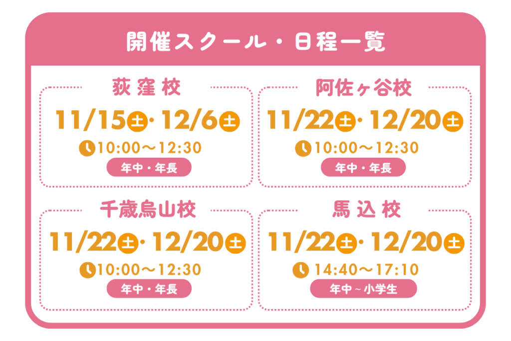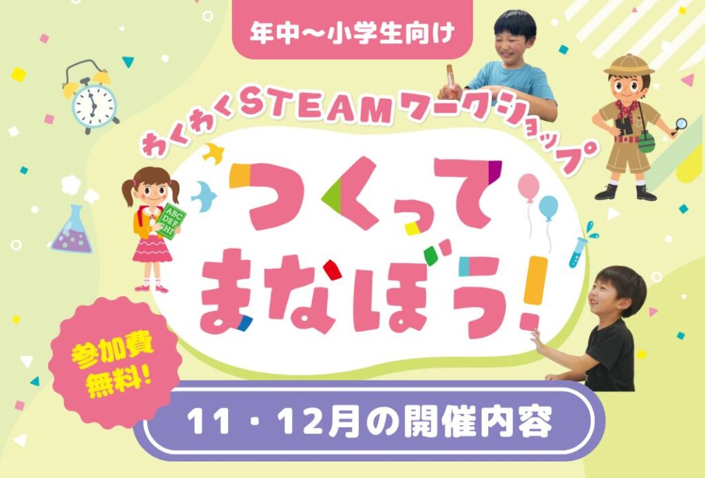 STEAM体験イベン... お知らせ 2025.08.07 【年中さん~小学生向け】STEAMワークショップイベントのお知らせ(11・12月の日程) ステモンアフタースクールで、年中さん~小学生向けSTEAMワークショップイベントを開催します! ■イベント内容 ■開催概要 参加費 無料 定員 各校舎日程ごとに10名まで ■申し込み方法 下記のボタンよりお申込みください。 過去の記事【年中さん~小学生向け】STEAMワークショップイベントのお知らせ(9・10月の日程) 新しい記事9月のアカデミー・おやつカレンダー スクールブログ一覧に戻る