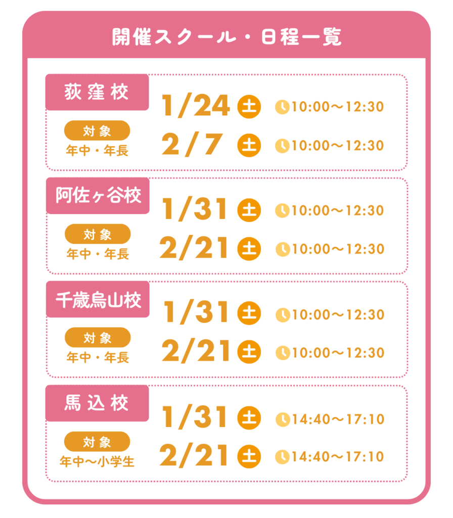 STEAM体験イベン... お知らせ 2025.10.23 【年中さん~小学生向け】STEAMワークショップイベントのお知らせ(1・2月の日程) ステモンアフタースクールで、年中さん~小学生向けSTEAMワークショップイベントを開催します! ■イベント内容 ■開催概要 参加費 無料 定員 各校舎日程ごとに10名まで ■申し込み方法 下記のボタンよりお申込みください。 過去の記事10月のアカデミー・おやつカレンダー 新しい記事11月のアカデミー・おやつカレンダー スクールブログ一覧に戻る