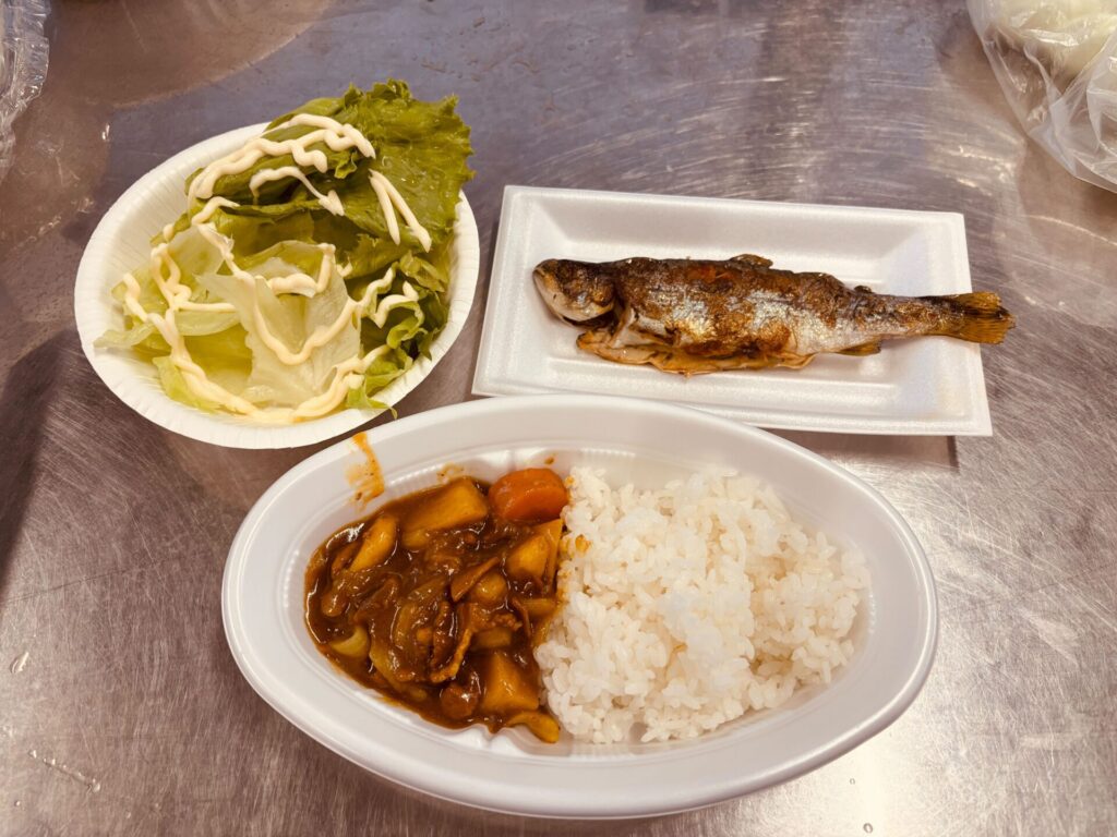 さきほど捕まえたマスは塩焼きにして、美味しくいただきました!