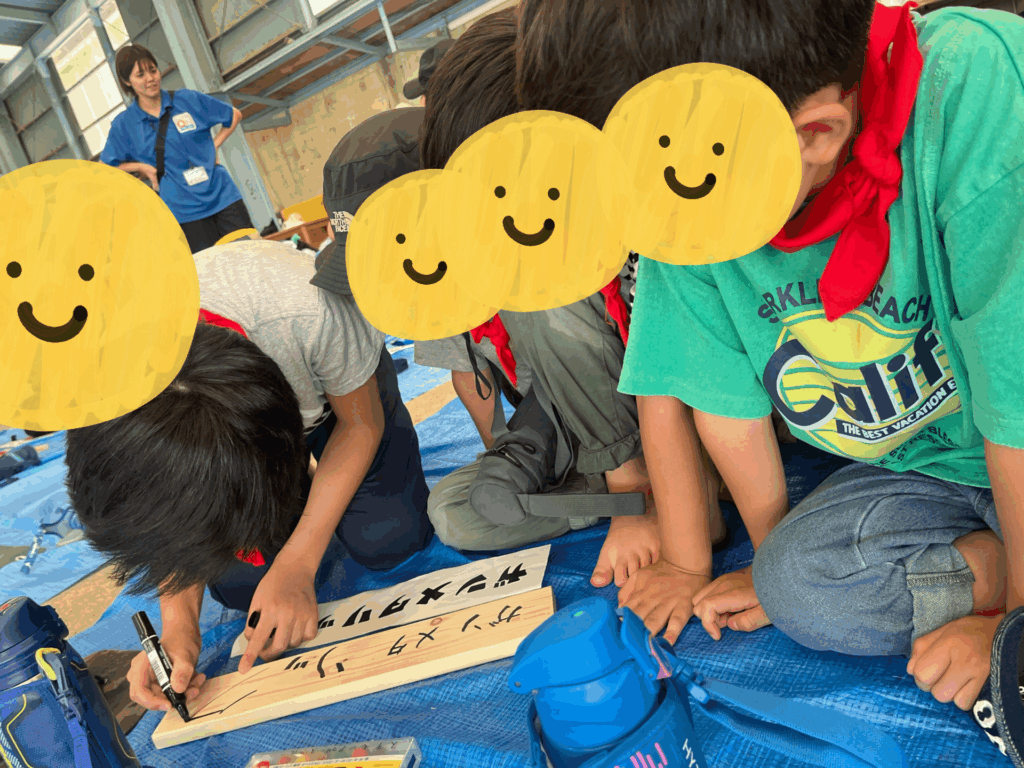 まず最初のアクティビティは、宿泊するバンガロー(小屋)に飾る「表札づくり」からスタート!