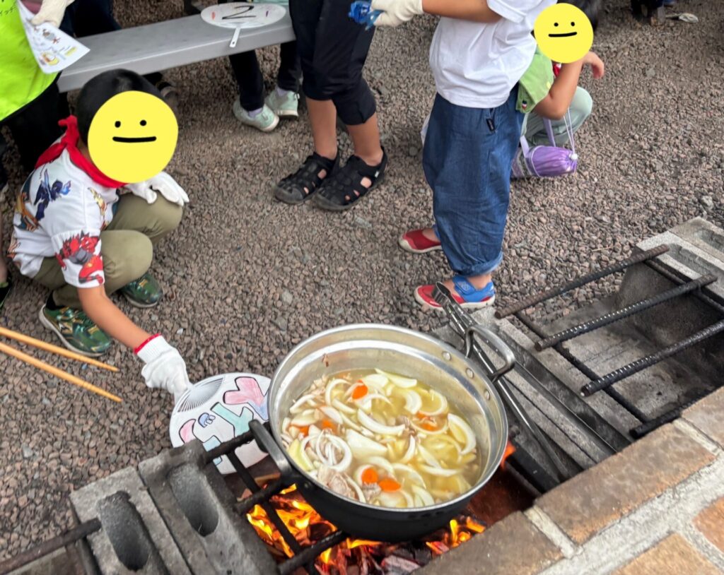 火起こしに初挑戦の1年生も、頼れる高学年がしっかりサポートしてくれました。食材の下ごしらえもバッチリ!