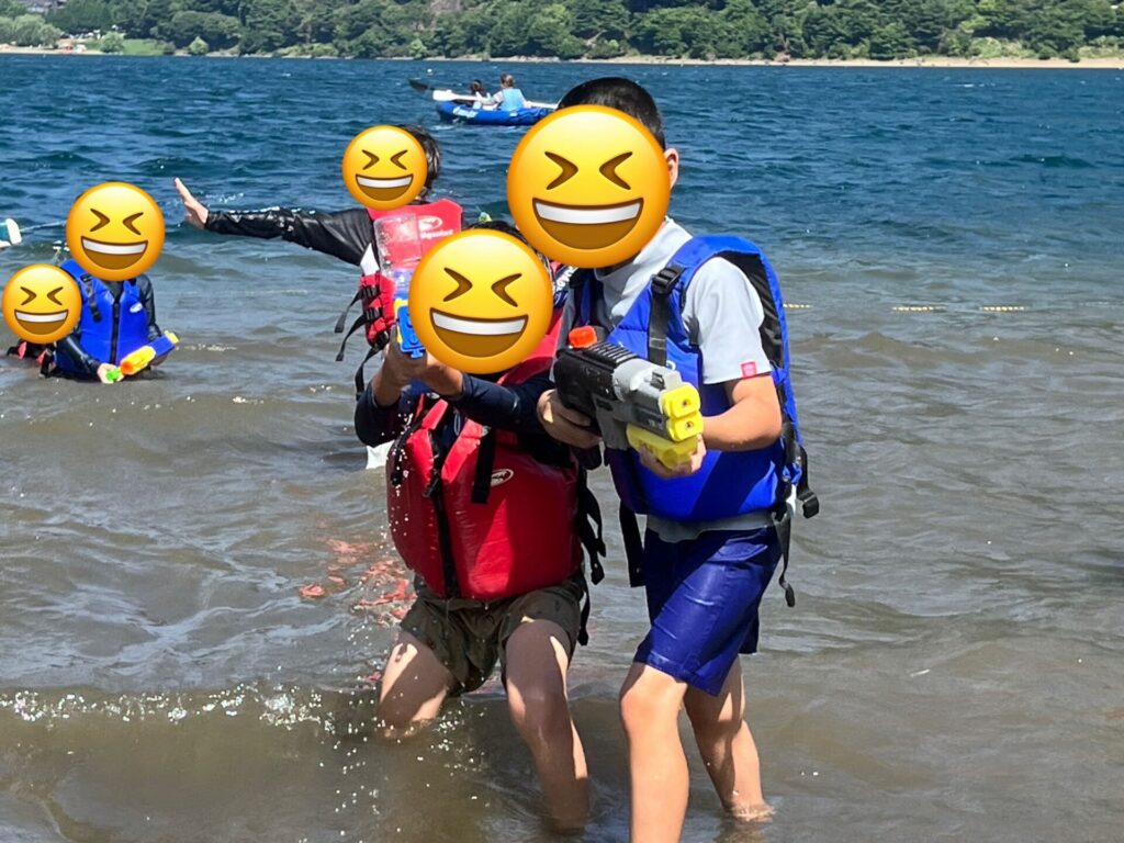 2日目は、みんなでラジオ体操をしたあと、朝ごはんを食べて、湖遊び&水鉄砲大会 スタートです!