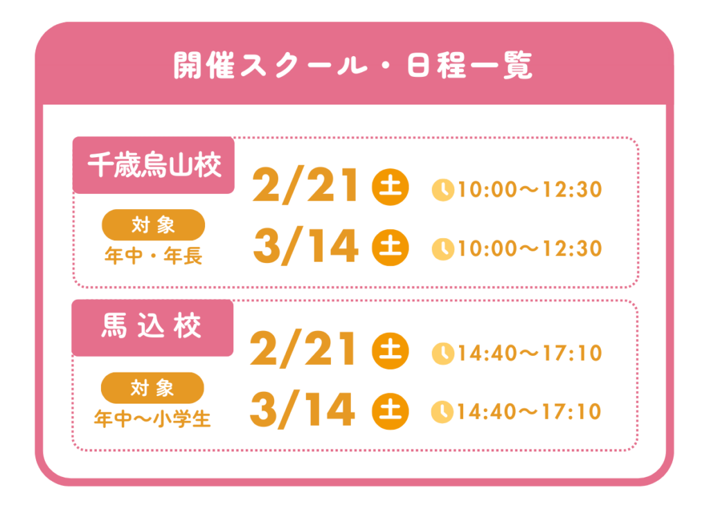 STEAM体験イベン... お知らせ 2026.02.02 【年中さん~小学生向け】STEAMワークショップイベントのお知らせ(2・3月の日程) ステモンアフタースクールで、年中さん~小学生向けSTEAMワークショップイベントを開催します! ■イベント内容 ■開催概要 参加費 無料 定員 各校舎日程ごとに10名まで ■申し込み方法 下記のボタンよりお申込みください。 過去の記事2月のアカデミー・おやつカレンダー 新しい記事3月のアカデミー・おやつカレンダー スクールブログ一覧に戻る